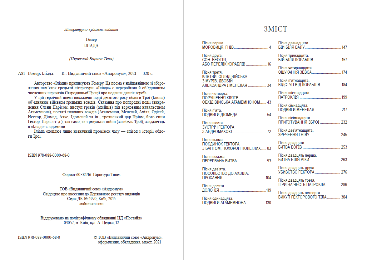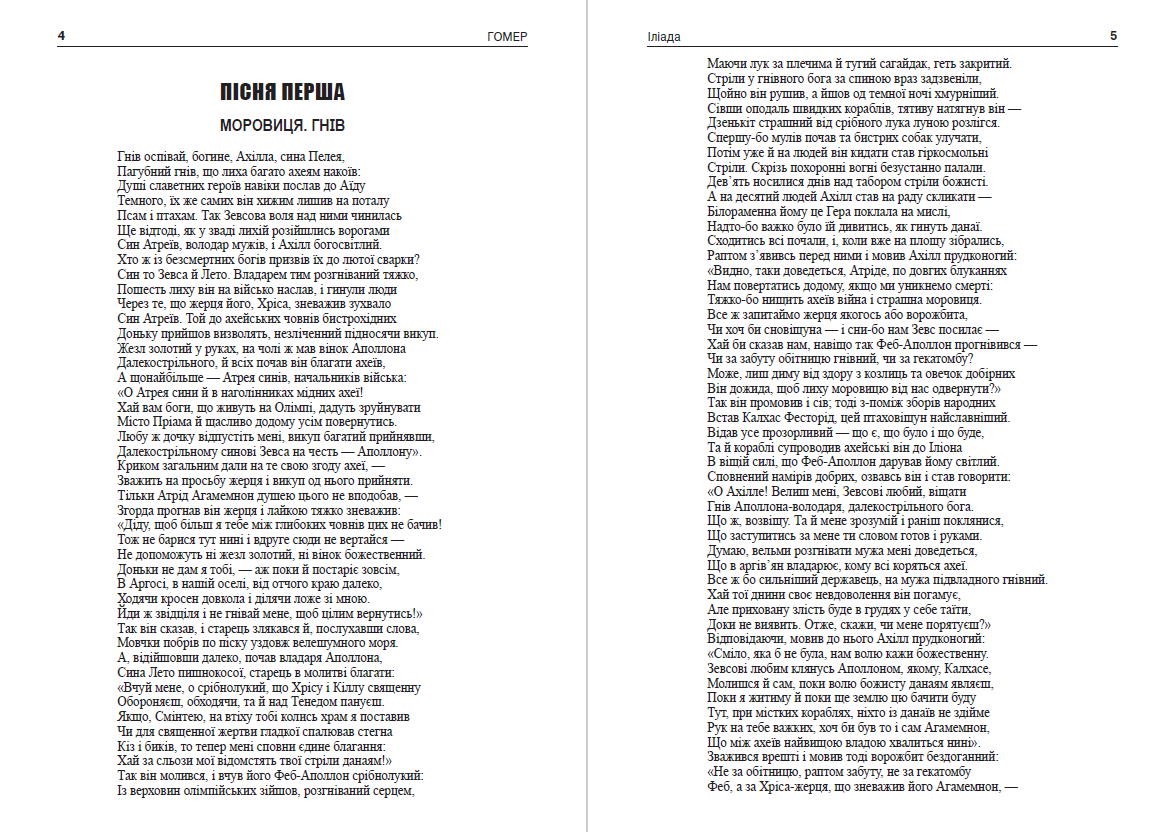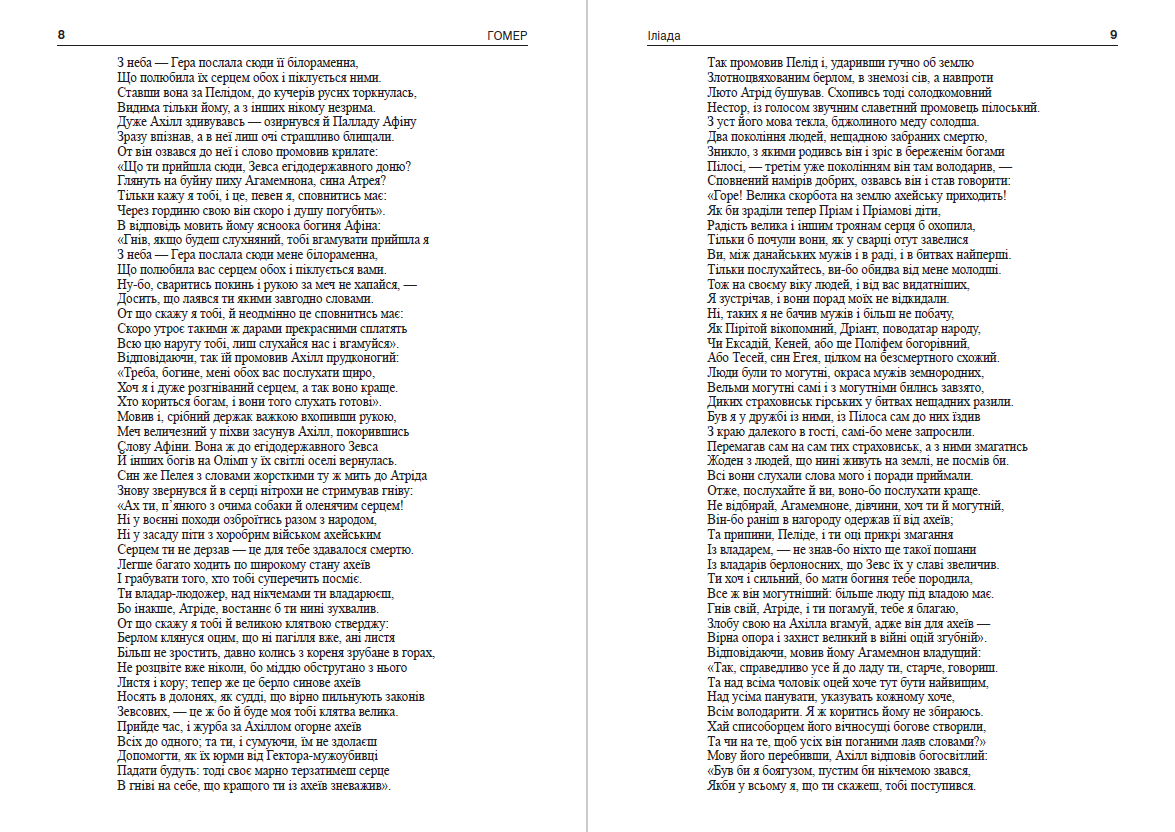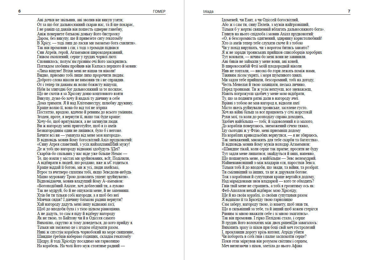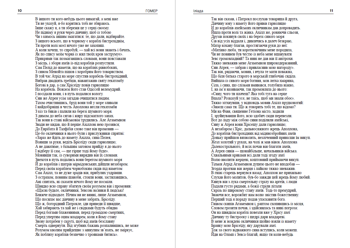 Авторство «Іліади» приписують Гомеру. Ця поема є найдавнішою зі збережених пам’яток грецької літератури. «Іліада» є переробкою й об’єднанням численних переказів Стародавньої Греції про подвиги давніх героїв. У цій героїчній поемі викладено події десятого року облоги Трої (Іліона) об’єднаним військом грецьких вождів. Сказання про попередні події (викрадення Єлени Парісом, виступ греків (ахейців) під верховним начальством Агамемнона), постаті головних вождів (Агамемнон, Менелай, Ахілл, Одісей, Нестор, Діомед, Аякс, Ідоменей та ін., троянський цар Пріам, його сини Гектор, Паріс і т. д.), так само, як і результат війни (загибель Трої), заздалегідь в «Іліаді» є відомими. Іліада охоплює лише незначний проміжок часу — епізод з історії облоги Трої.