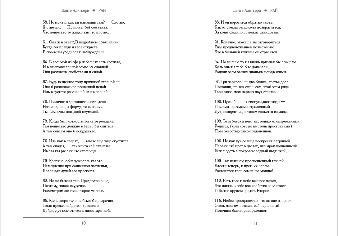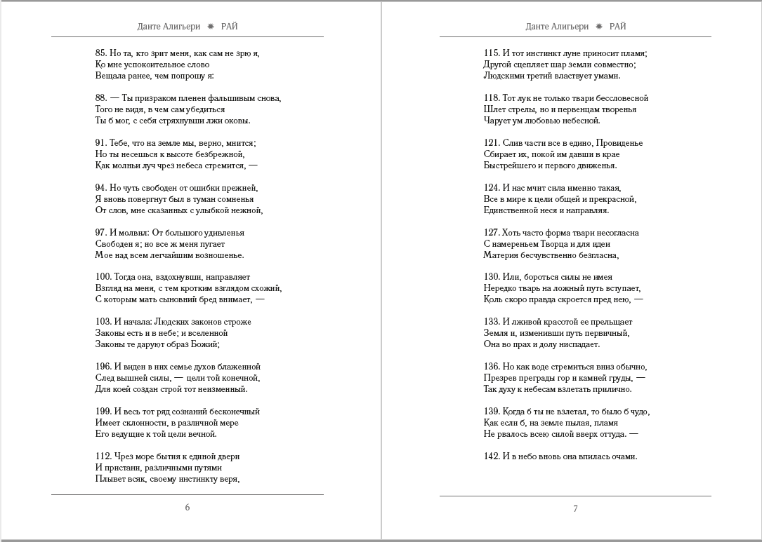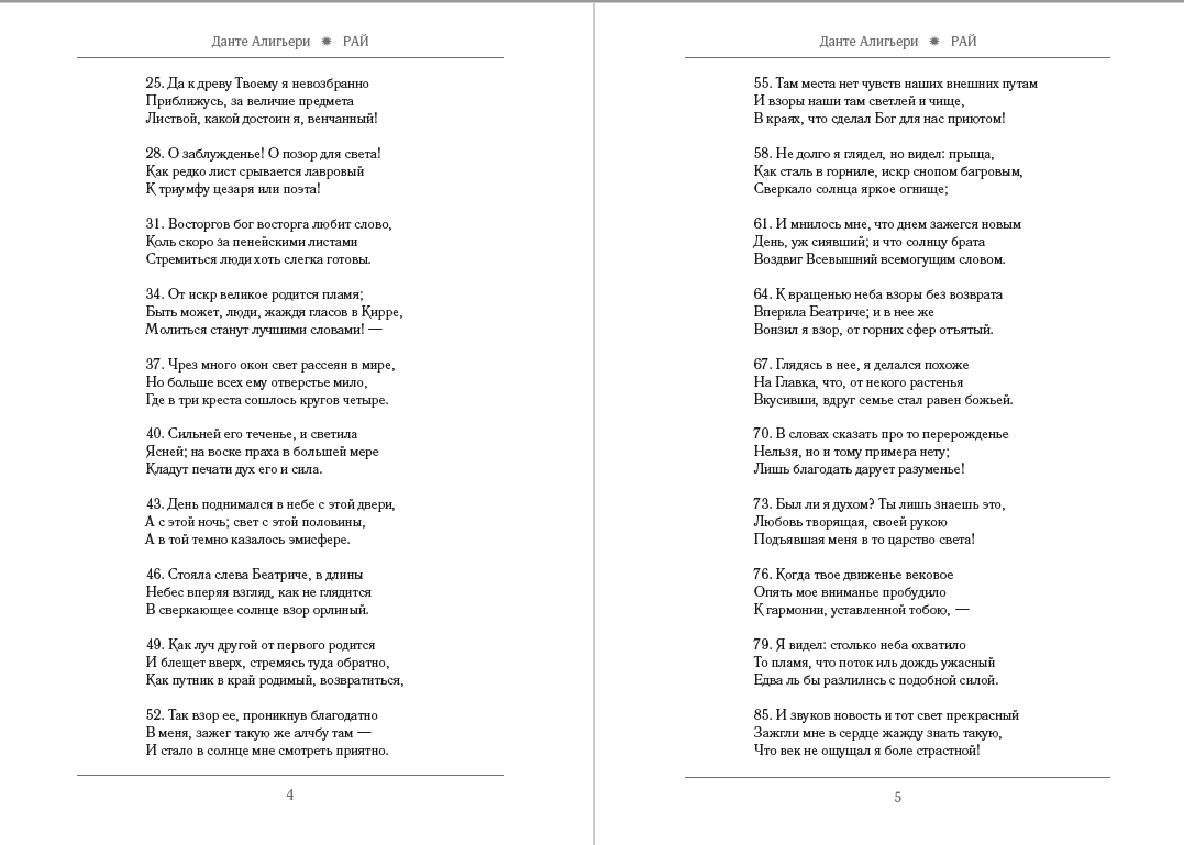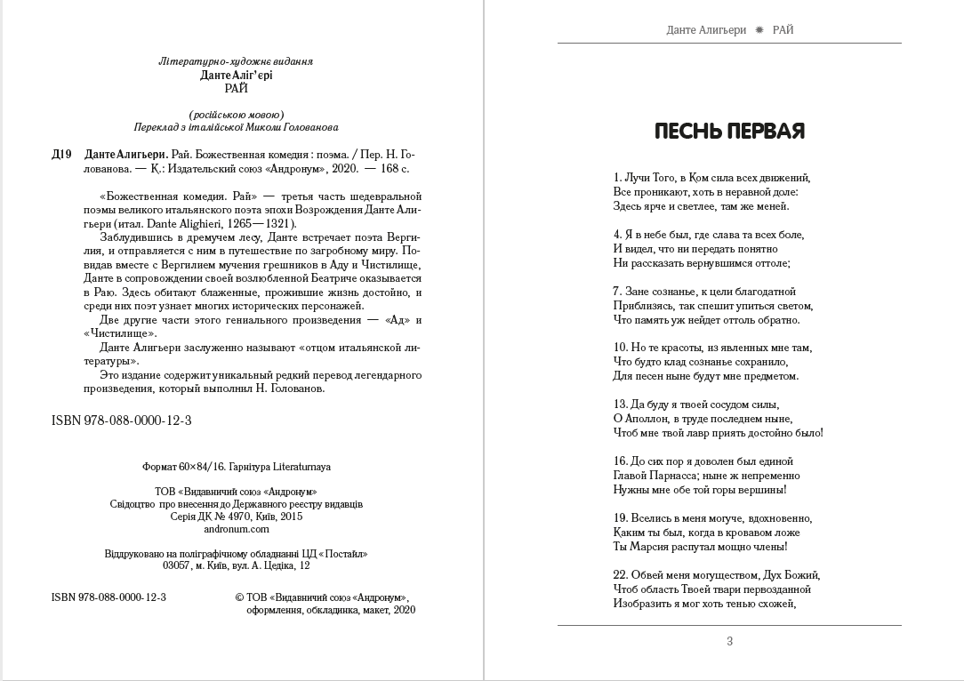 «Божественная комедия. Рай» — третья часть шедевральной поэмы великого итальянского поэта эпохи Возрождения Данте Алигьери (итал. Dante Alighieri, 1265—1321). Заблудившись в дремучем лесу, Данте встречает поэта Вергилия, и отправляется с ним в путешествие по загробному миру. Повидав вместе с Вергилием мучения грешников в Аду и Чистилище, Данте в сопровождении своей возлюбленной Беатриче оказывается в Раю. Здесь обитают блаженные, прожившие жизнь достойно, и среди них поэт узнает многих исторических персонажей. Две другие части этого гениального произведения — «Ад» и «Чистилище». Данте Алигьери заслуженно называют «отцом итальянской литературы». Это издание содержит уникальный редкий перевод легендарного произведения, который выполнил Н. Голованов.