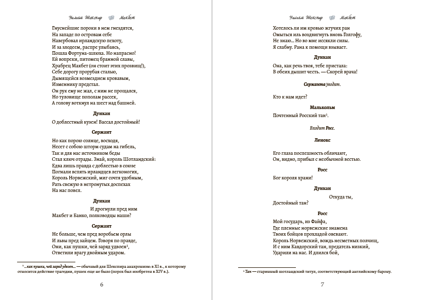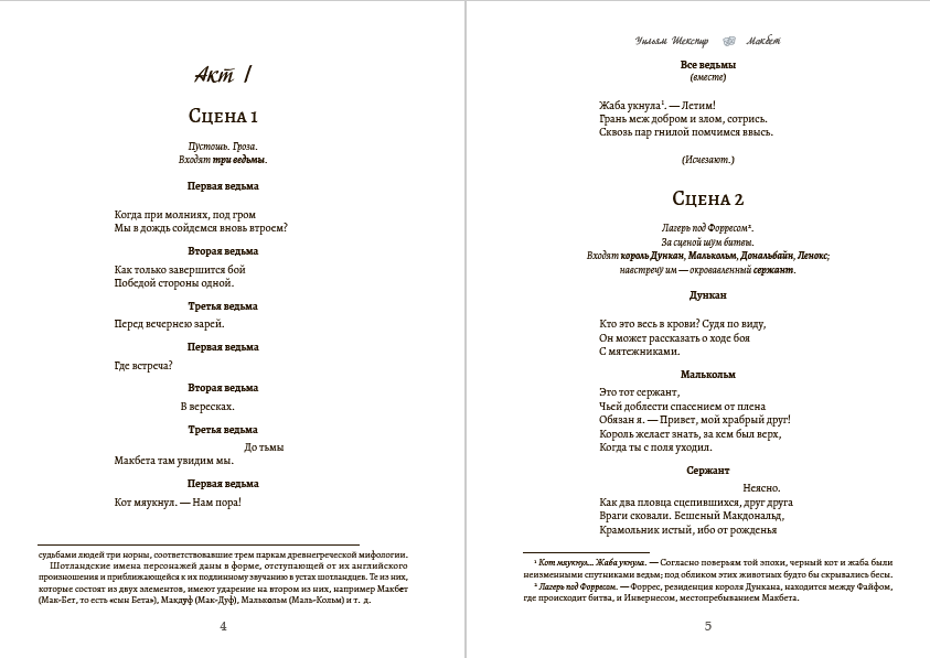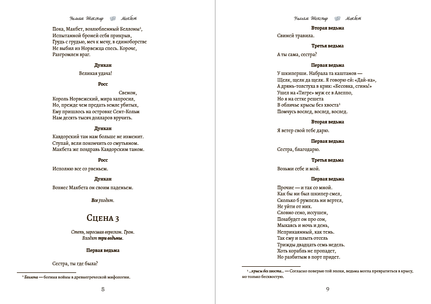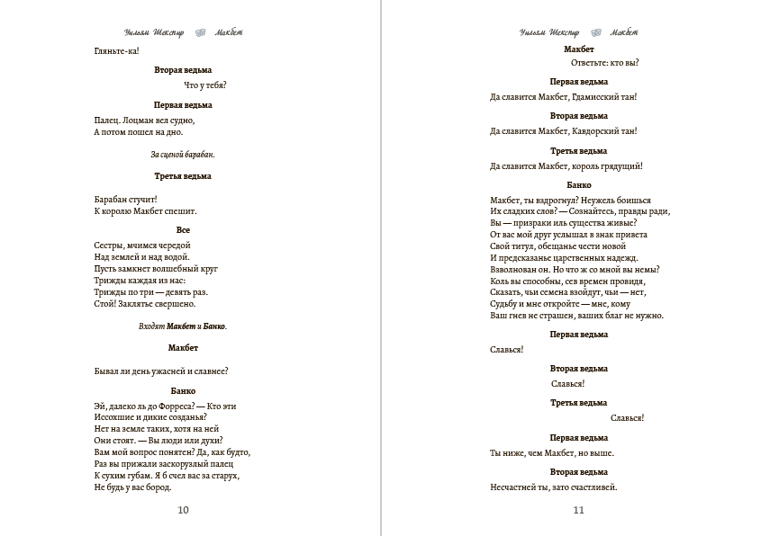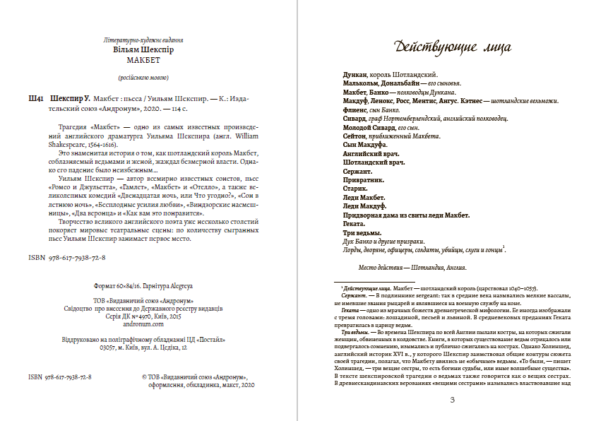 Трагедия «Макбет» — одно из самых известных произведений английского драматурга Уильяма Шекспира (англ. William Shakespeare, 1564-1616). Это знаменитая история о том, как шотландский король Макбет, соблазняемый ведьмами и женой, жаждал безмерной власти. Однако его падение было неизбежным… Уильям Шекспир — автор всемирно известных сонетов, пьес «Ромео и Джульетта», «Гамлет», «Макбет» и «Отелло», а также великолепных комедий «Двенадцатая ночь, или Что угодно?», «Сон в летнюю ночь», «Бесплодные усилия любви», «Виндзорские насмешницы», «Два веронца» и «Как вам это понравится». Творчество великого английского поэта уже несколько столетий покоряет мировые театральные сцены: по количеству сыгранных пьес Уильям Шекспир занимает первое место.