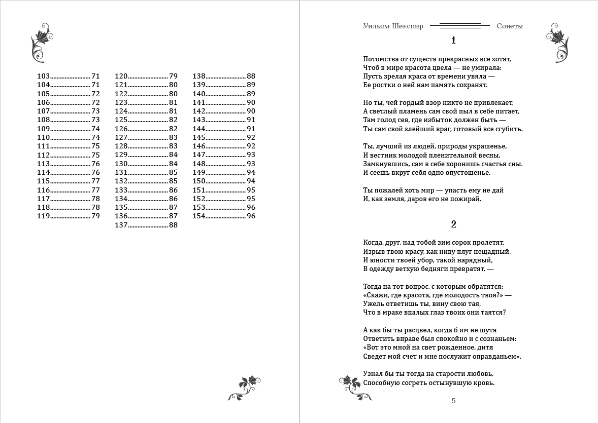«Сонеты» — замечательные стихотворения непревзойденного поэта Уильяма Шекспира (англ. William Shakespeare, 1564–1616). Цикл сонетов состоит из 154 стихотворений, различных по своей тематике (любовь, разлука, дружба, ревность и другие). Исследователи творческого наследия Шекспира до сих пор спорят о подлинности авторства. Творчество великого драматурга уже несколько столетий покоряет мировые театральные сцены: по количеству сыгранных пьес Уильям Шекспир лидирует и по сей день. Перевод Н. В. Гербеля. Иллюстрации Ольги Московченко.