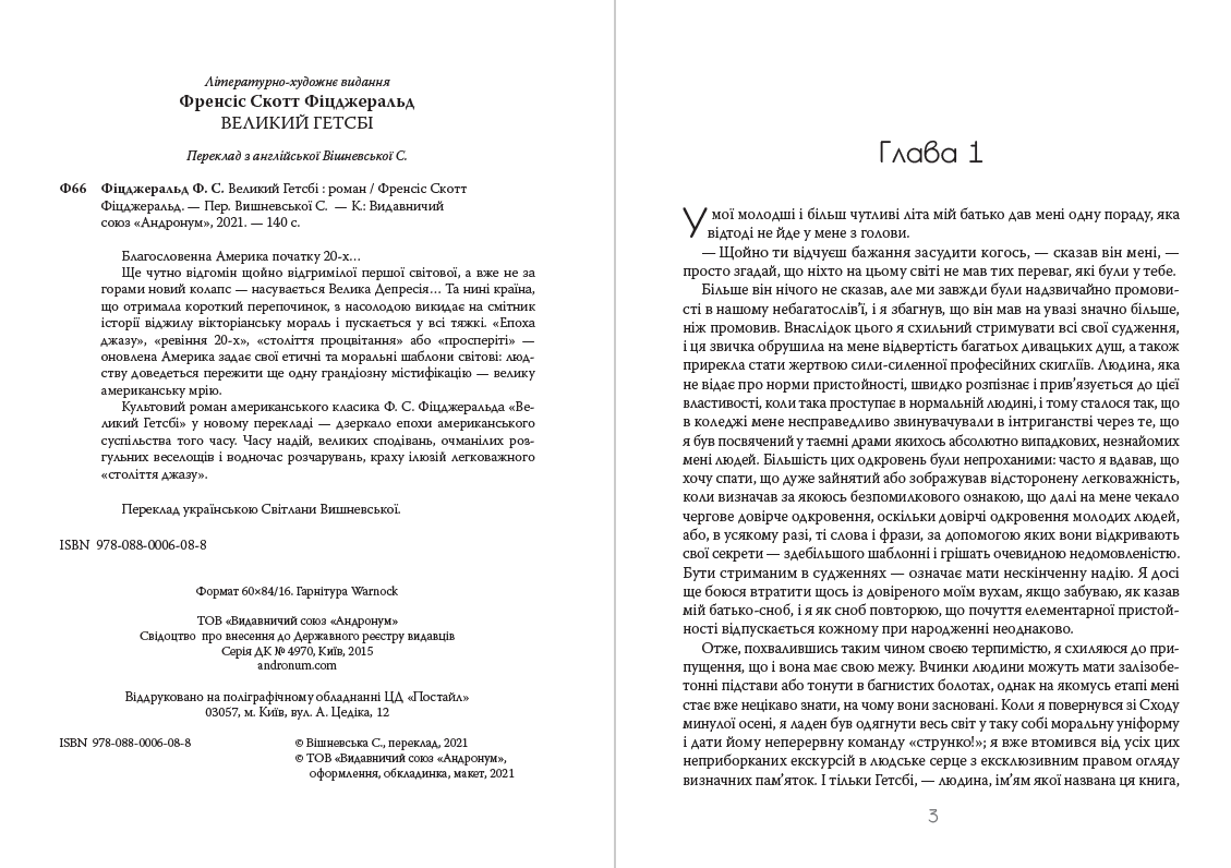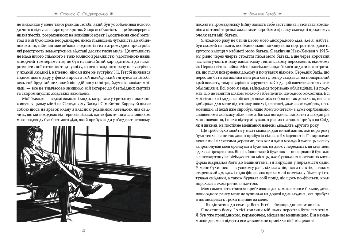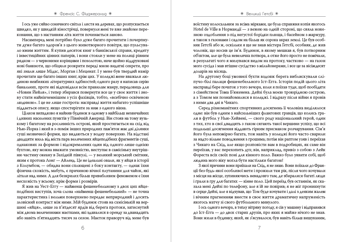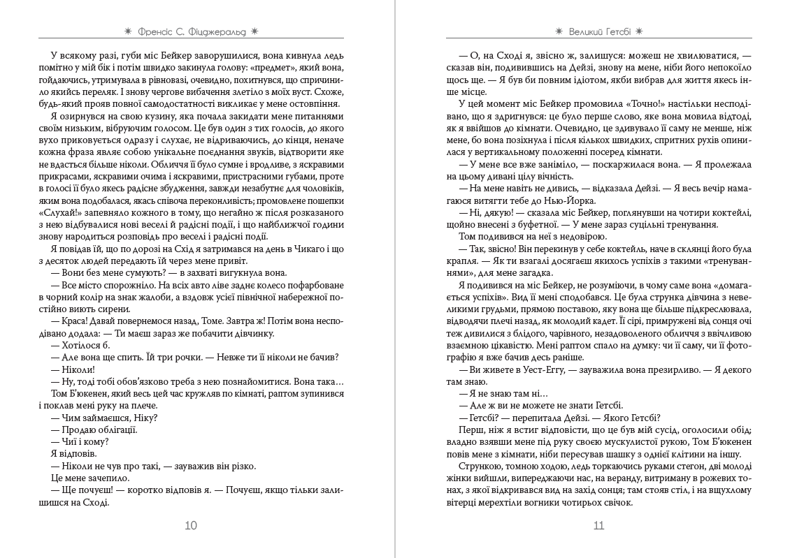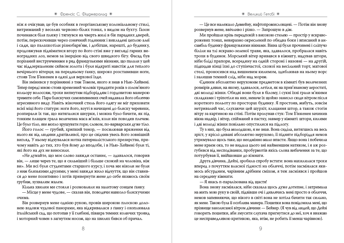 Благословенна Америка початку 20-х… Ще чутно відгомін щойно відгримілої першої світової, а вже не за горами новий колапс — насувається Велика Депресія… Та нині країна, що отримала короткий перепочинок, з насолодою викидає на смітник історії віджилу вікторіанську мораль і пускається у всі тяжкі. «Епоха джазу», «ревіння 20-х», «століття процвітання» або «просперіті» — оновлена Америка задає свої етичні та моральні шаблони світові: людству доведеться пережити ще одну грандіозну містифікацію — велику американську мрію. Культовий роман американського класика Ф. С. Фіцджеральда «Великий Гетсбі» у новому перекладі — дзеркало епохи американського суспільства того часу. Часу надій, великих сподівань, очманілих розгульних веселощів і водночас розчарувань, краху ілюзій легковажного «століття джазу». Переклад українською Світлани Вишневської.
